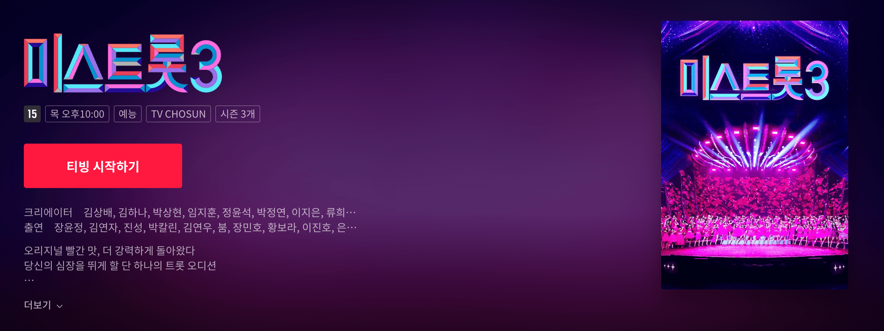 이후 아래와 같은 모습으로 들어실 수 있습니다. 아래로 조금만 내리시면 생방송 시간에 미스트롯3를 즐길 수 있습니다. 이 곳에서 투표도 가능합니다. 응원하는 가수에게 투표도 꼭 해주세요!