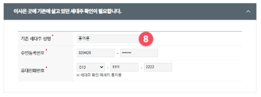 *예를 들어, 부모님 댁에서 독립하는 경우 부모님 중 세대주로 등록되어 있는 분의 연락처를 입력하시면 됩니다.