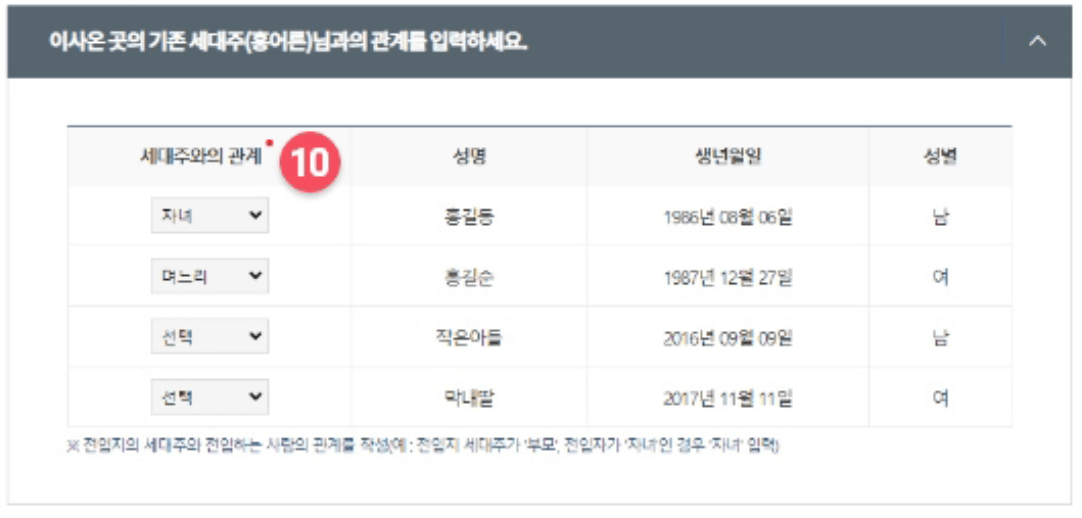 주소검색으로 새로온 주소를 상세주소까지 입력하시면 되겠습니다. 7번의 경우 2가지 중 해당 되는 것을 선택하시면 되는데, 부모님 댁 혹은 세대주 밑에서 독립하는 경우는 '이사온 사람끼리 세대구성' 을 체크하시고 반대로 다시 본가나 다른 분의 집으로 들어가는 경우는 아래의 '기존에 살고 있는 세대주가 있는 경우'를 체크하시면 되겠습니다. 나머지 8,9,10번은 현재 상황에 알맞게 기입을 하시면 되겠습니다.