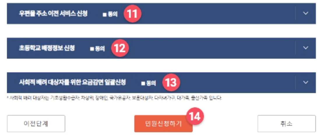 본인에 해당하는 서비스를 체크 후 민원신청하기로 전입신고를 마무리 하시면 되겠습니다.