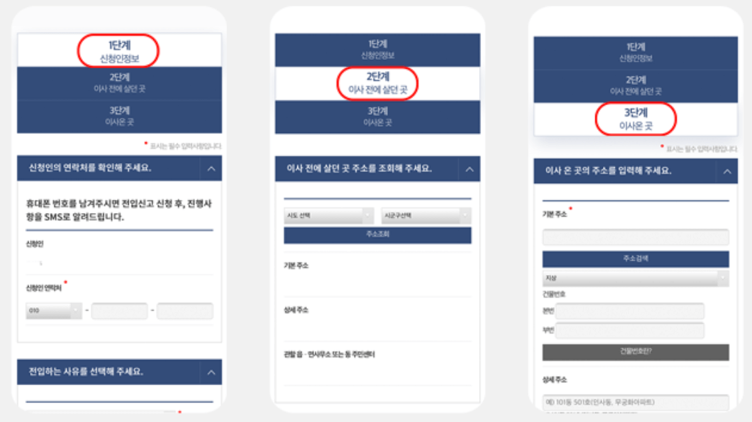 이전에 살던 곳으로 이사 전에 살고있는 주소 정보를 입력후 주소지를 조회 하시고 해당 주소지에서 이사가는 사람을 체크합니다. 이후 신청인이 세대주가 아닌경우 현재 세대주 확인 메세지를 알리기 위하여 이사 전 세대주의 연락처를 입력합니다.